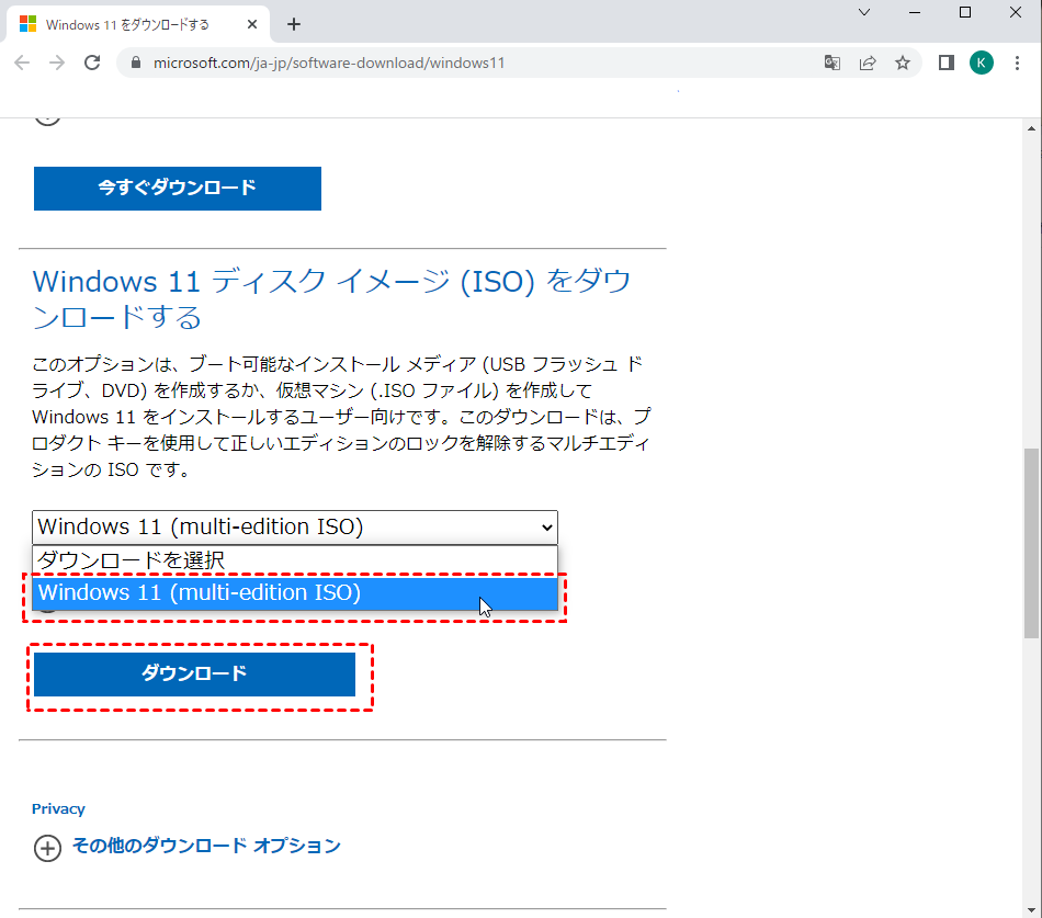 1. 「Windows 11をダウンロードする」ページを開きます。「Windows 11 ディスク イメージ(ISO)をダウンロードする」の項目で、「Windows 11(multi-edition ISO)」を選択し、「ダウンロード」をクリックします。