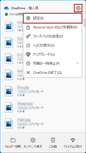 ステップ 1. タスクバーから「OneDrive」アイコンをクリックし、歯車アイコン→「設定」を選択し、「設定」ウィンドウを開きます。