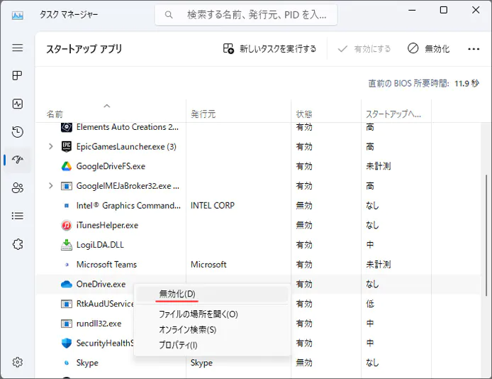 2. タスクマネージャーでOneDriveをスタートアップから無効にする