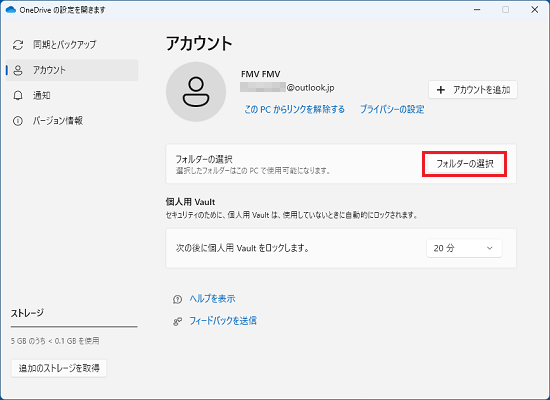 ステップ 3. OneDriveの設定画面で、「アカウント」タブを開き、「フォルダーの選択」ボタンをクリックします。
