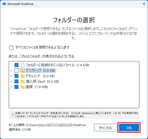 ステップ 4. すると、現在OneDriveがクラウドに同期しているすべてのフォルダーが表示されます。同期したくないフォルダのチェックを外し、「OK」をクリックします。すべてのフォルダのチェックを外すと、すべてのフォルダの同期を解除することができます。