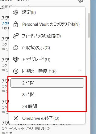 ステップ 2. 次に、OneDriveのウィンドウから歯車アイコンをクリックします。そして、「同期の一時停止」をクリックし、同期を無効にする期間を選択します。