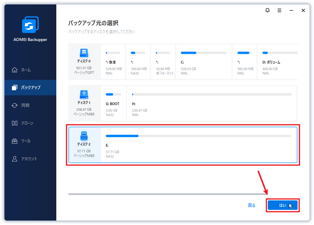 手順 2. 「バックアップ元を選択」をクリックして、バックアップしたいSDカードを選択します。