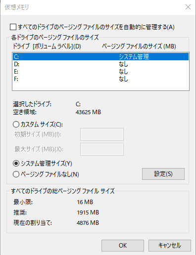 4. 「仮想メモリ」ウィンドウが開いたら、「すべてのドライブのページング ファイルのサイズを自動的に管理する」のチェックを外し、システムドライブを選択します。