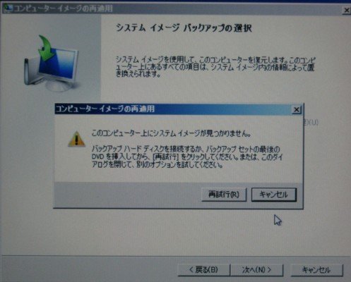 しかし、次の「システムイメージバックアップの選択」画面に「このコンピューター上にシステムイメージが見つかりません。バックアップハードディスクを接続するか、バックアップセットの最後のDVDを挿入してから、[再試行]をクリックしてください。または、このダイアログを閉じて、別のオプションを試してください。」というエラーメッセージが表示されます。