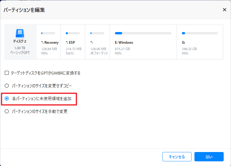 パーティションを編集:SSDの容量はHDDと同じまたはより大きい場合、このオプションでSSDのパーティションのサイズを手動か自動で調整することができます。これより、クローン後にSSDに使えない未割り当て領域が作成されません。