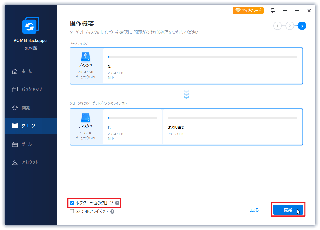 ステップ 4. デフォルトで、AOMEI Backupperは不良セクターをスキップする「インテリジェントクローン」でクローンを実行します。不良セクタを含むHDD全体をターゲットディスクにクローンしたい場合、「セクター単位のクローン」(クローン先のディスクの容量はクローン元のHDDと同じまたはより大きい場合のみに利用可能)にチェックを入れてください。