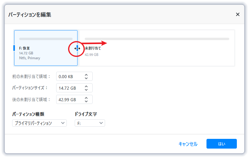 - 「パーティーションを編集」を使うと、パーティションのサイズを手動で変更できます。