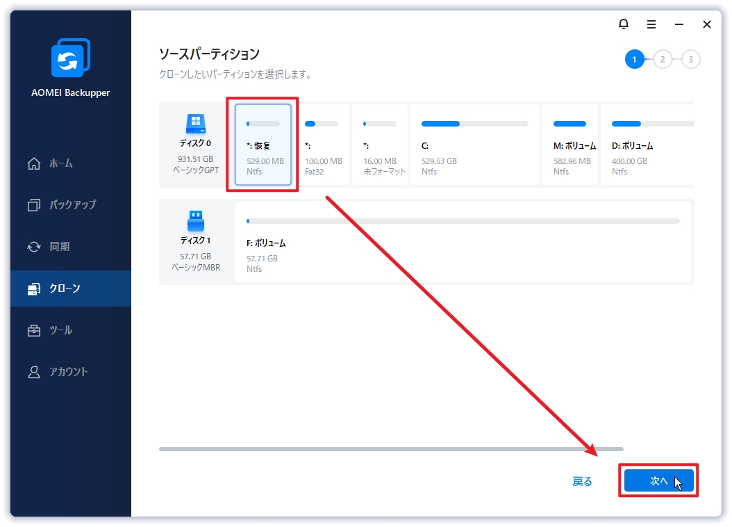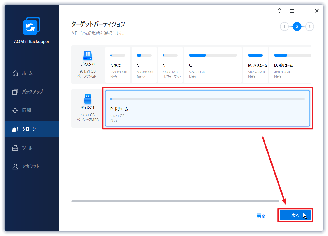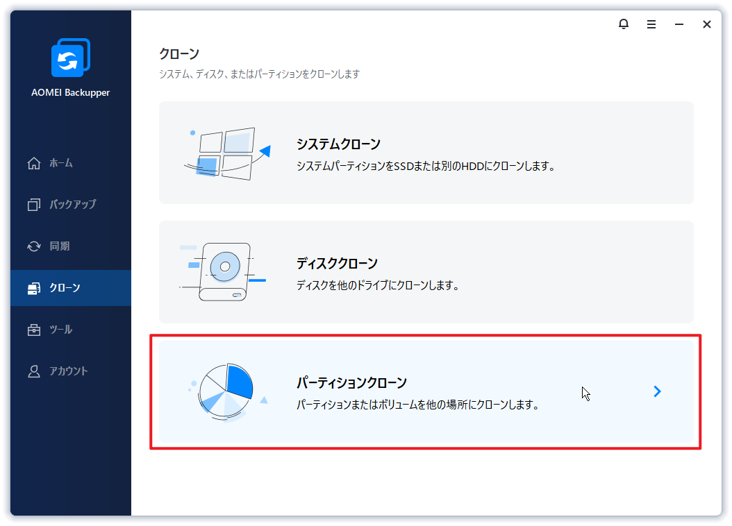 ステップ 1. AOMEI Backupper Professionalをダウンロード、インストール、実行します。「クローン」タブで「パーティションクローン」を選択します。