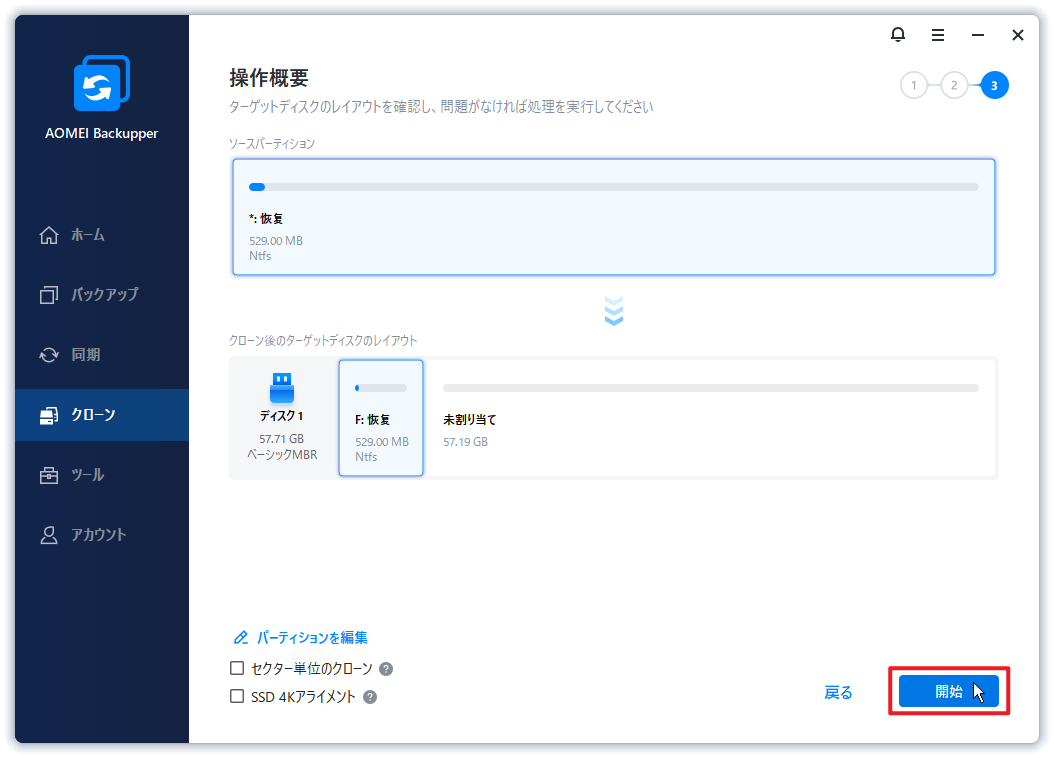 ターゲットディスクはSSDの場合は、「SSD 4Kアライメント」を選択して、SSDの読み込みと書き込みの速度を向上させます。