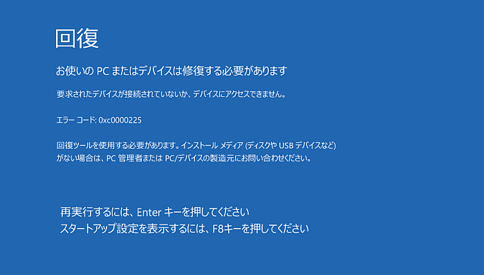 0xc0000225エラーとは、Windowsが起動に必要なシステムファイルやブート構成データ(BCD)を読み込めなかったときに表示されるブートエラーです。
