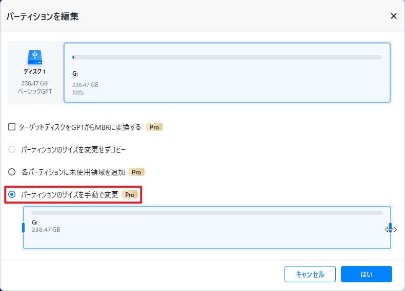- パーティションを編集:ターゲットディスクはソースディスクより大きい場合、容量を最大限に活用するには、この機能で、「各パーティションに未使用領域を追加」「パーティションのサイズを手動で変更」の2つオプションからターゲットディスクのパーティションのサイズを手動/自動で調整できます。