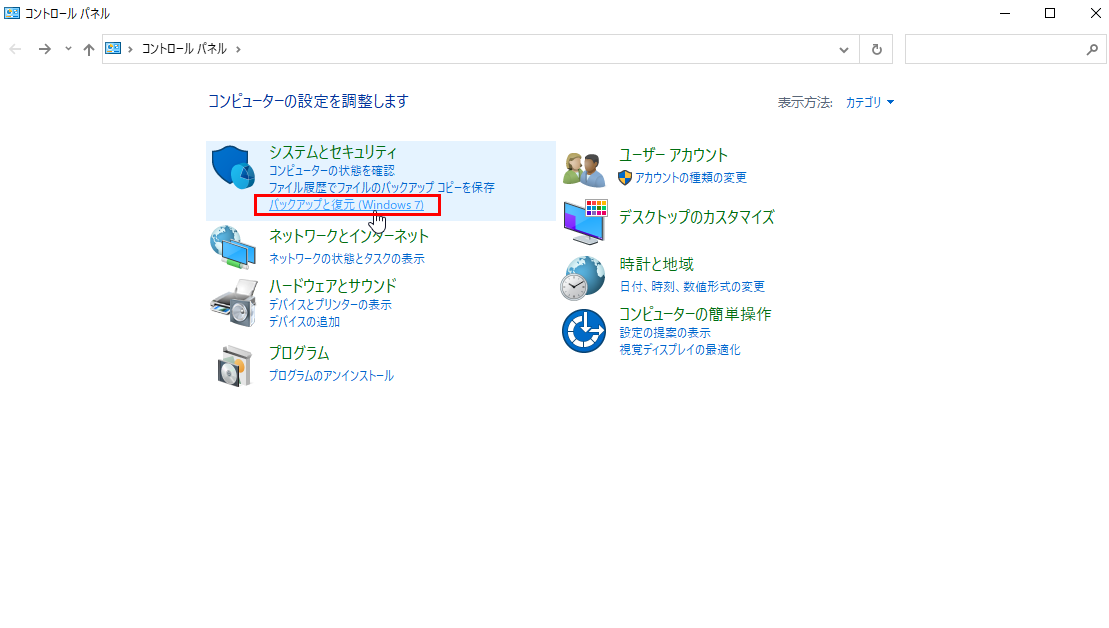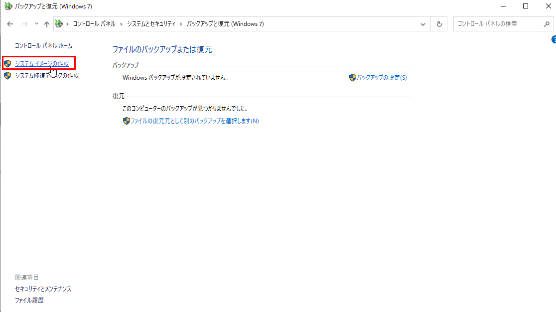 ❷「システムとセキュリティ」の下で「バックアップと復元」をクリックし、「システム イメージの作成」をクリックします。
