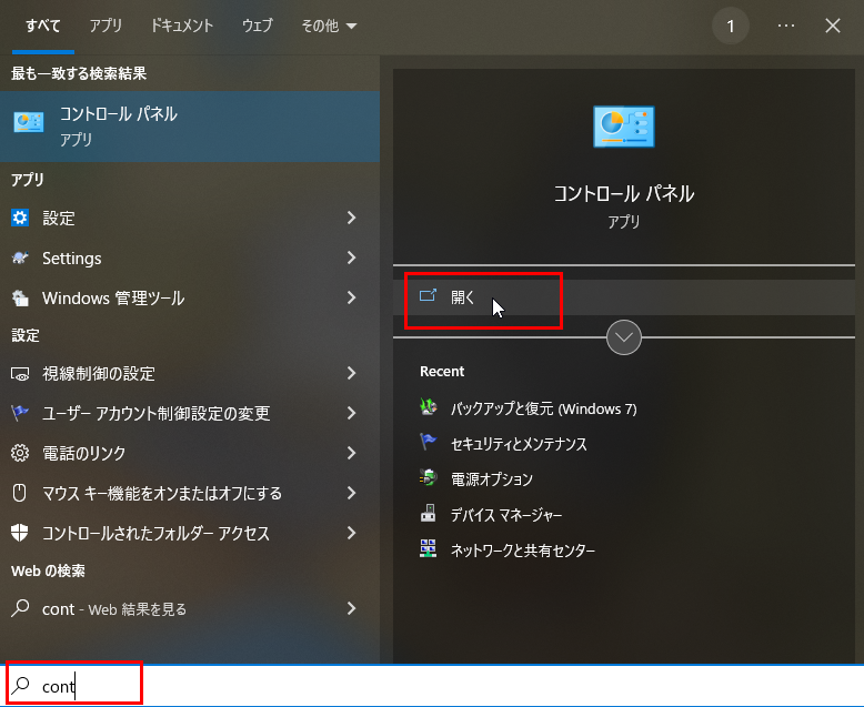 ❶検索ボックスに「cont」を入力し、「コントロール パネル」を開きます。