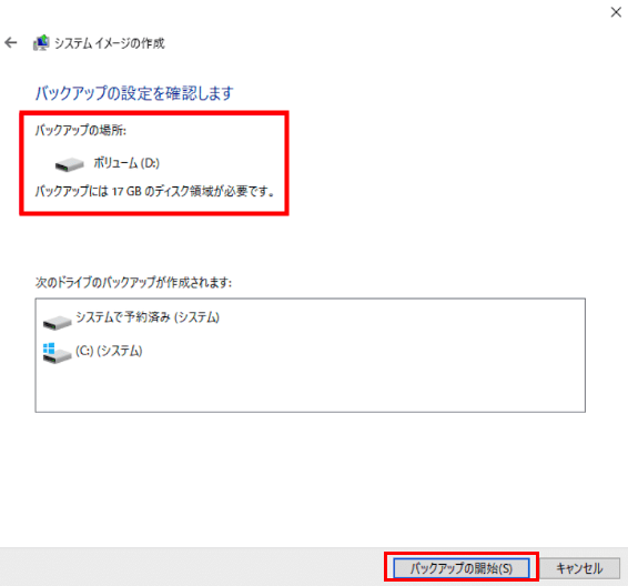 ❸そして、バックアップ保存先を選択します。バックアップの設定を確認した後、「バックアップの開始」をクリックします。