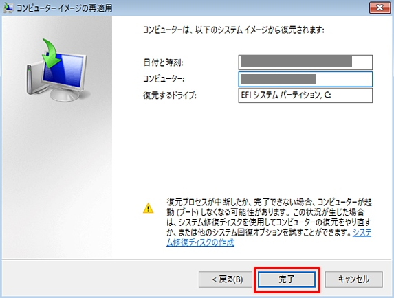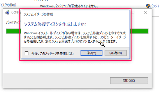 ❹バックアップイメージの作成が完了した後、「システム修復ディスクを作成しますか」のウィンドウが表示されます。Windowsのインストールディスクがある場合は「いいえ」を選択し、それがない場合はまずCD/DVDを用意した後「はい」をクリックします。次にコンピューターをシャットダウンしてください。