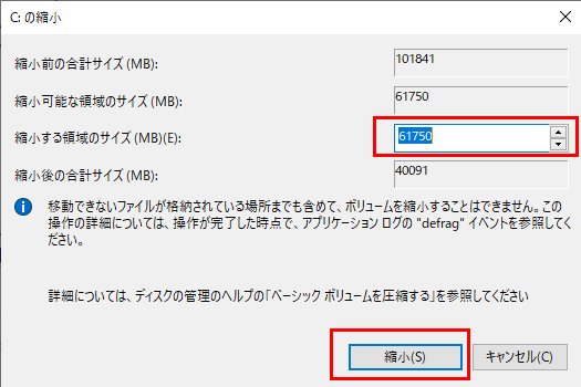❷そして「縮小する領域のサイズ」に、SSDの使用可能容量より10%少ない値を入力してください。