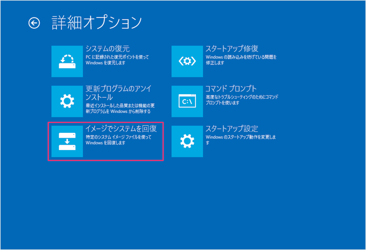 ❶PCケースを開け、バックアップディスク以外のドライブの接続をすべて断ちます。そして、修復ディスクあるいはWindows 10のインストールディスクを挿入します。挿入したディスクからPCが起動した後、「オプションの選択」→「トラブルシューティング」→「イメージでシステムを回復」を順に選択します。