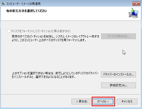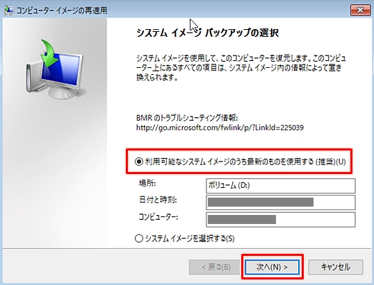 ❷次は、「利用可能なシステム イメージのうち最新のものを使用する」をチェックします。復元したいハードディスクが消去されるので、復元したいハードディスクが1つだけを確認してください。