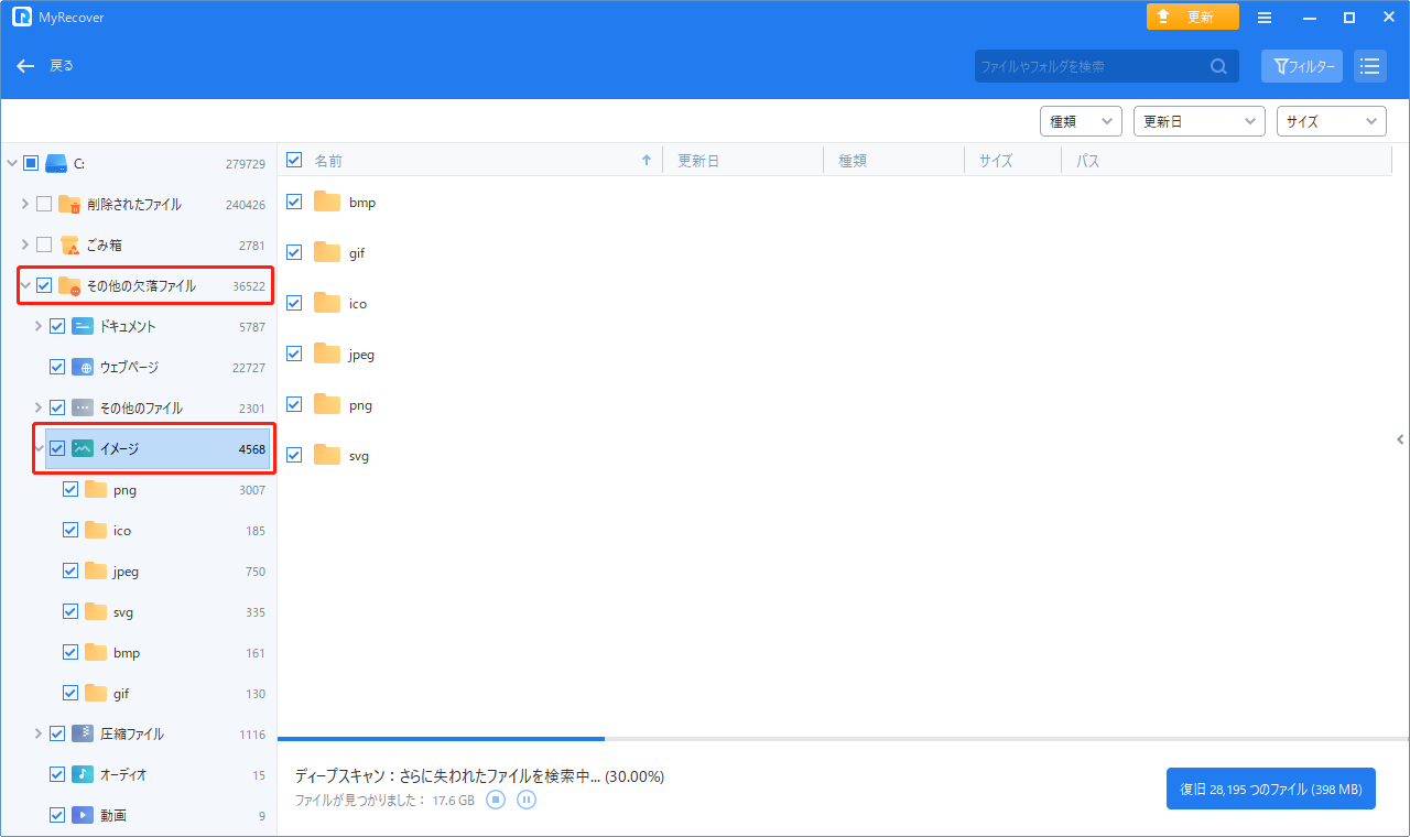復元したい画像が見つからなかった場合、「その他の欠落ファイル」→「画像」に移動し、その画像があるかどうか確認します。