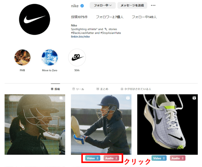 3. Instagramにアクセスし、ダウンロードしたい動画のページを開きます。動画が表示されると、再生画面の近くに「Video(動画ダウンロード)」および「Audio(音声ダウンロード)」のボタンが表示されます。