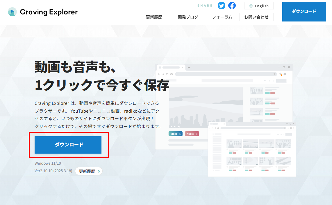 Craving Explorerは、日本で人気のある無料の動画ダウンロードソフトで、YouTubeやInstagramをはじめ、さまざまな動画サイトに対応しています。MP4形式での保存はもちろん、動画から音声を抽出して保存することも可能です。