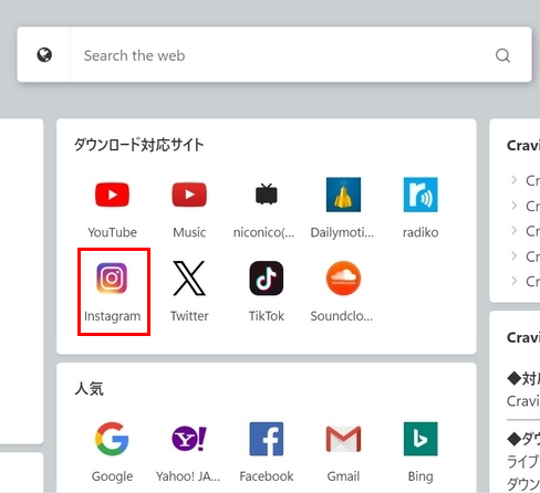 2. Craving Explorerを起動すると、自動的にGoogle Chromeが開きます。画面上部のメニューから「ダウンロード対応サイト」をクリックし、表示されたリストの中からInstagramを選択します。