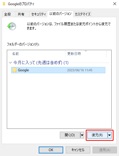 ステップ 4. 「以前のバージョン」タブの下で、Chromeの閲覧履歴を削除した前に作成されたバックアップを選択して、「復元」→「適用」→「OK」をクリックします。