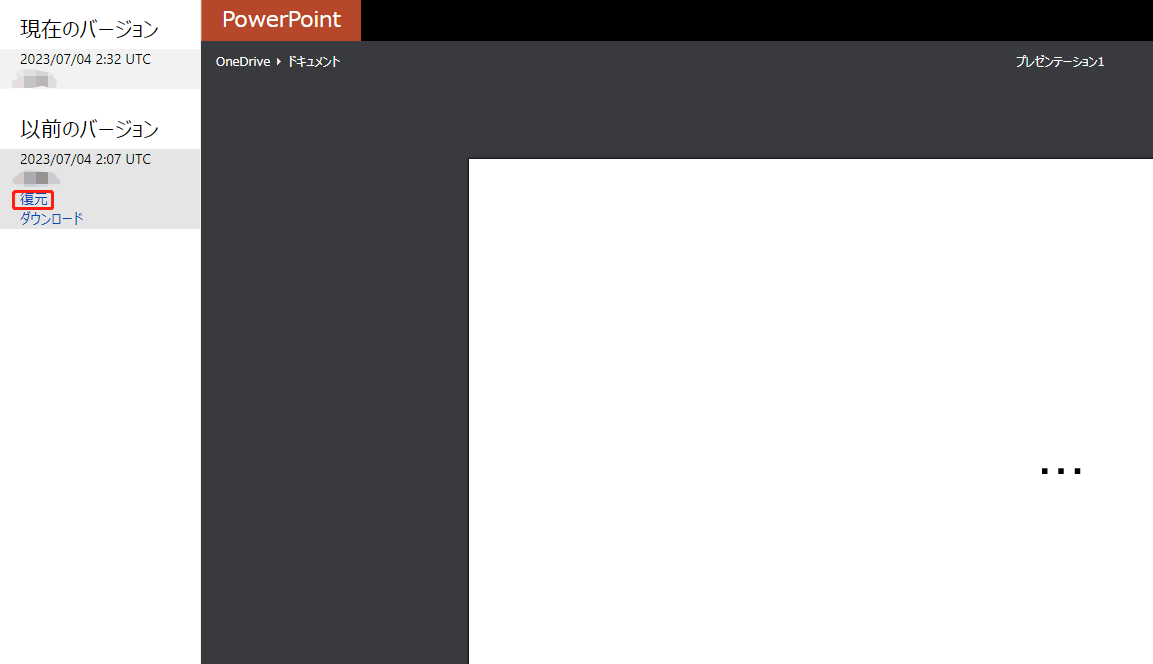 ステップ 2. 選択したファイルのバージョン履歴が表示されます。必要なバージョンを選択し、「復元」をクリックします。または、現在のバージョンも保持したい場合は、「ダウンロード」をクリックします。