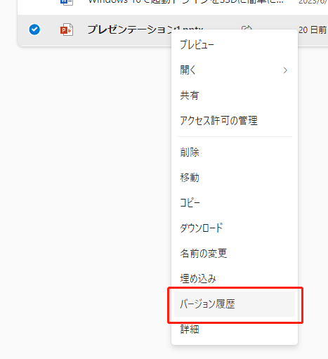 ステップ 1. OneDriveのWebサイトにログインします(デスクトップアプリもできます)。復元したいファイルを見つけて右クリックし、「バージョン履歴」を選択します。