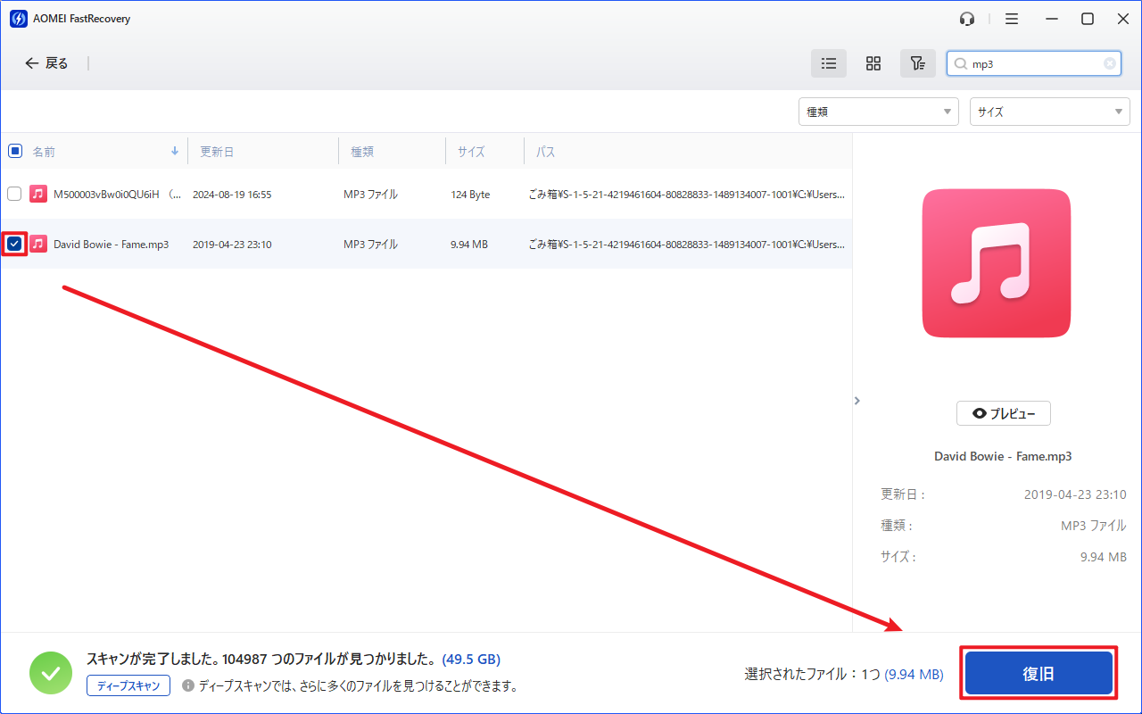 ステップ 3. 復元したいMP3ファイルを選択し、「復元」ボタンをクリックすると、ファイルが元の場所に復元されます。