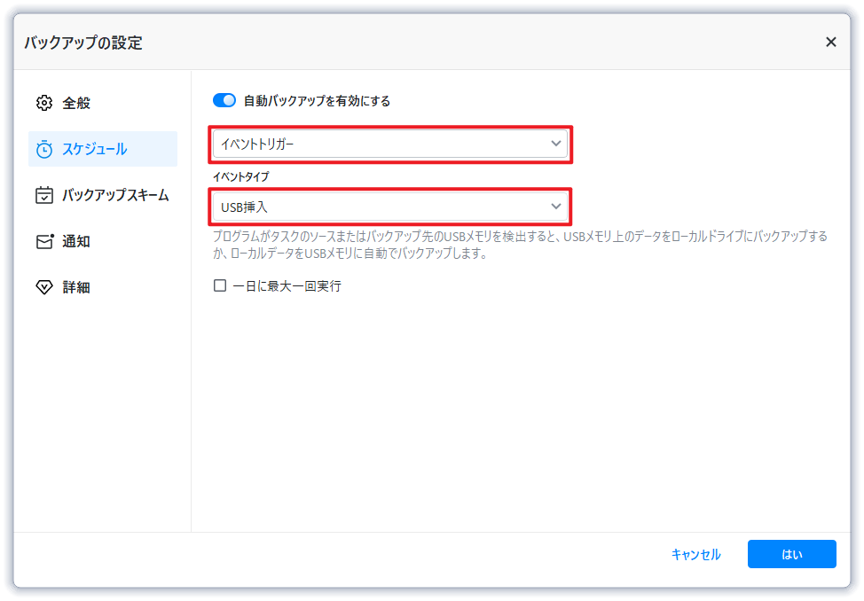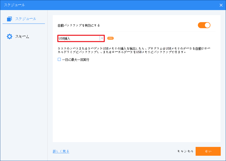 その「スケジュール(自動バックアップ)」機能には、「USB挿入」(今無料で利用可能)というモードをサポートしています。これに有効にすると、SDカードをPCに挿入するたびに、バックアップが自動的に始まります。ダウンロードしてドラレコの重要データを守りましょう。