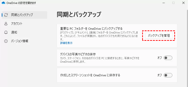 2. 表示されたウィンドウ内で、「同期とバックアップ」セクションを開き、「バックアップを管理」をクリックします。