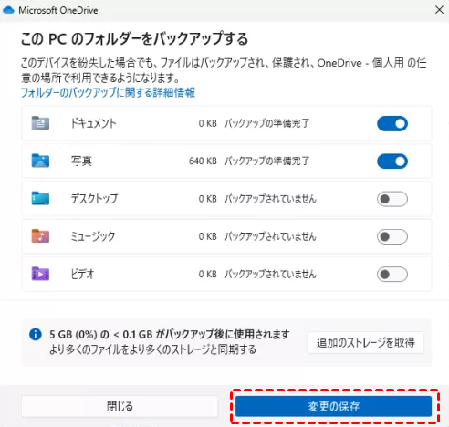 3. 同期を解除したいフォルダのチェックを外し、「変更の保存」をクリックします。確認ダイアログが表示されたら、「バックアップを停止」を選んで操作を確定します。