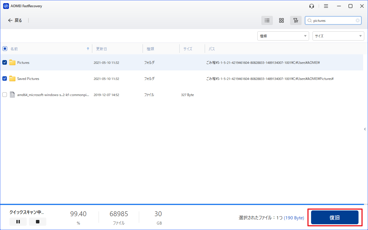 ステップ 2. AOMEI FastRecoveryは自動的に復元可能なファイルをスキャンします。失われたピクチャフォルダをより早く見つけるために、検索ボックスで「Pictures」と入力してください。