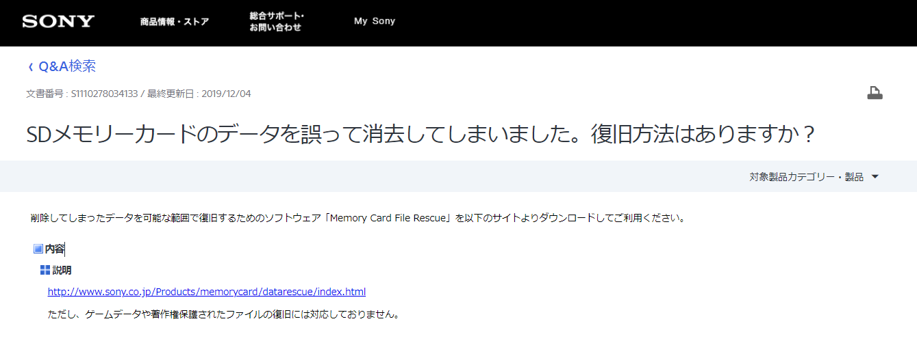 SONYは、ユーザーがソニーのストレージメディアから失われた写真や動画などを復元するための「Memory Card File Rescue」を提供しています。