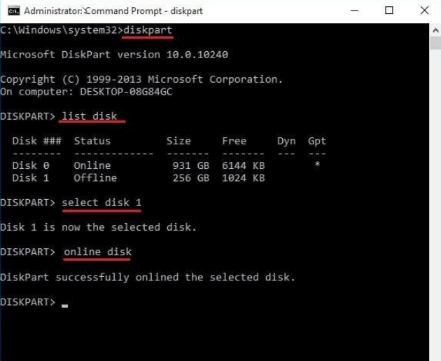 修正2. Diskpartで無効なダイナミックディスクを再アクティブ化する
