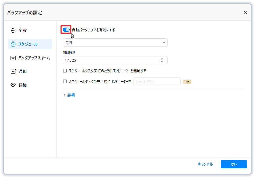 ステップ 3. 「スケジュール」をクリックし、ニーズに応じて自動バックアップの頻度をデイリー(毎日)/ウィークリー(毎週)/マンスリー(毎月)/イベントトリガー(システム起動/シャットダウン、サインイン/サインアウト)/USB挿入に設定し、「はい」→「開始」をクリックします。