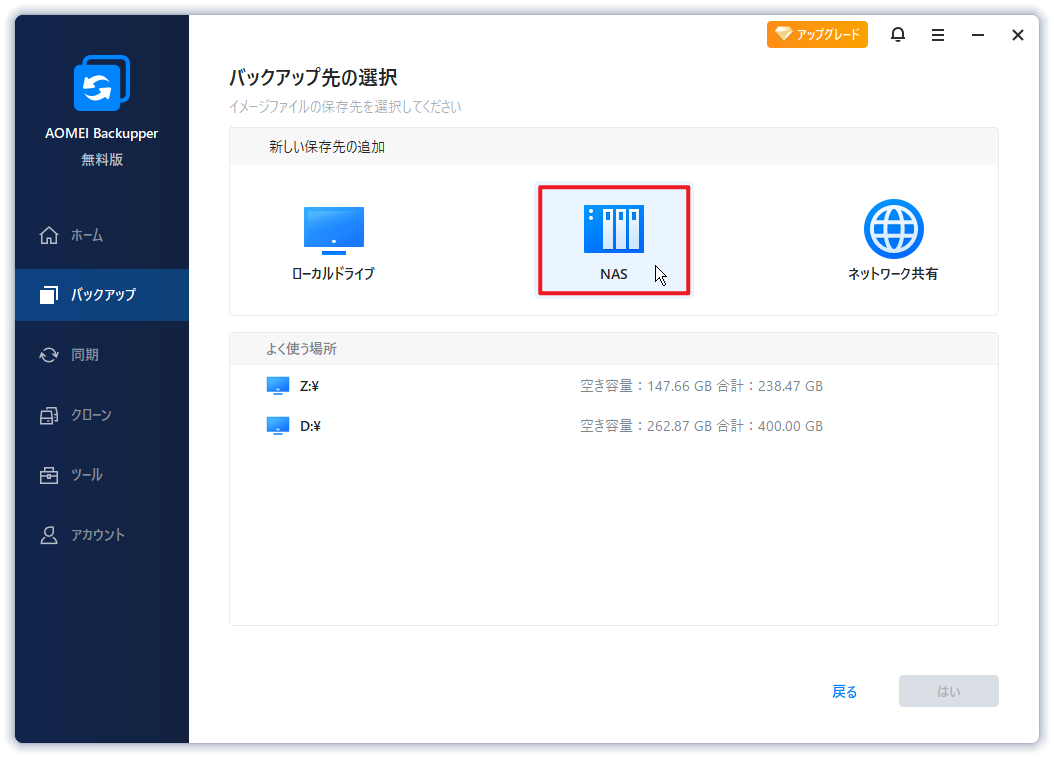 4. そして、バックアップ先(バックアップイメージファイルを保存する場所)を選択する必要があります。AOMEI BackupperがNASにバックアップすることをサポートします。