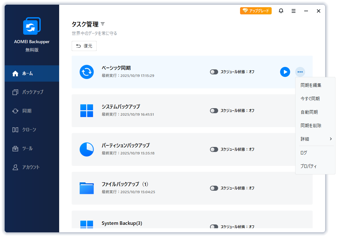 ステップ 1. AOMEI Backupper Standardをダウンロードし、インストールし、起動します。「同期」タブをクリックし、「ベーシック同期」を選択します。※必要に応じて有料版にアップグレードして「ミラー同期」または「リアルタイム同期」を選択することも可能です。