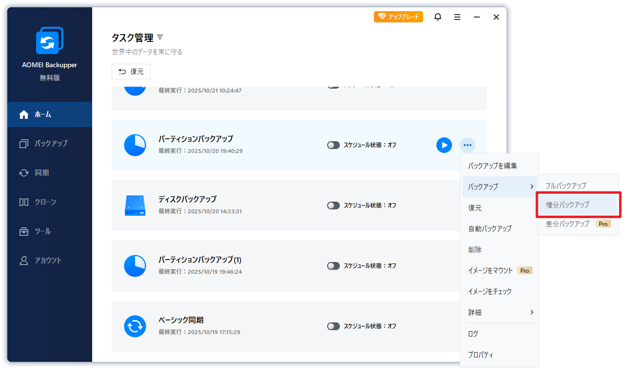 ※増分バックアップ&差分バックアップについてより詳しい情報は、「増分バックアップ&差分バックアップ」を参照してください。