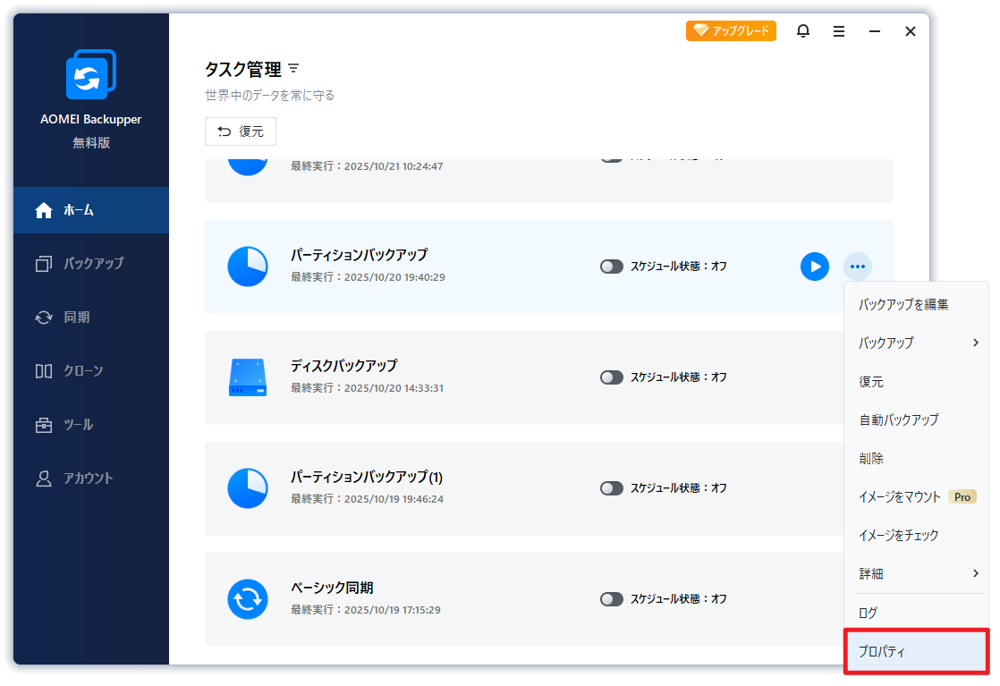 「ホーム 」タブで、対象のバックアップタスクを選択して、「プロパティ」をクリックします。