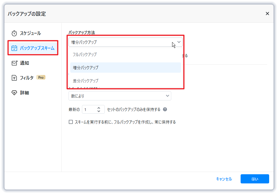 ちなみに、AOMEI Backupper Standardでは、増分バックアップは時間とスペースを大幅に節約するバックアップ方法として、強く推奨されています。スケジュールインターフェイスの下部にある「スキーム」をクリックすると、「増分バックアップ」はデフォルトのバックアップ方法であることがわかります。しかし、他の方法をご希望の場合は、フルバックアップと差分バックアップからご希望のバックアップ方法を選択することもできます(差分バックアップはProfessional版でサポートされています)。
