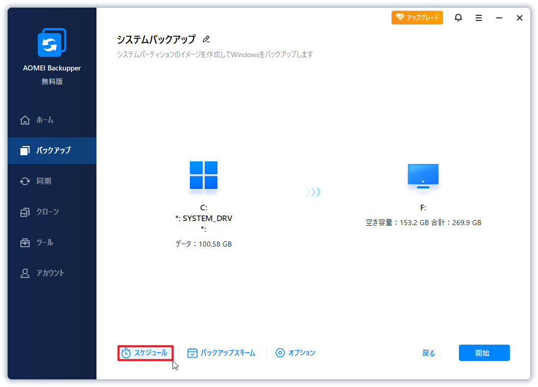 AOMEI Backupperはスケジュールの設定機能を持っています。バックアップスケジュールを設定するには、バックアップ画面の左下隅にある「スケジュール」オプションをクリックします。