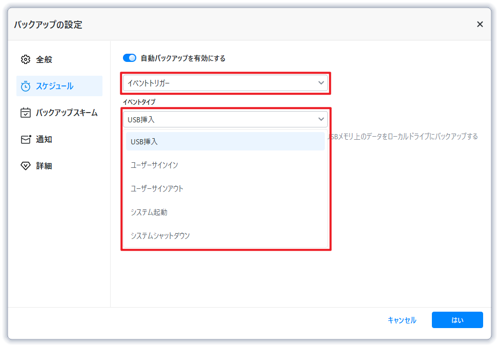 イベントトリガーモードでは、システムのシャットダウンまたはスタートアップ、ユーザーのログインまたはログオフ時に、イベントトリガーによるバックアップを実行するように設定することができます。