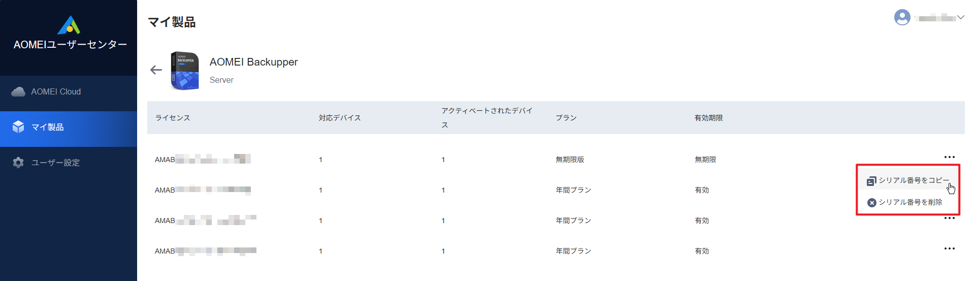 AOMEIユーザーセンターでは、購入済みのAOMEI製品ライセンスも管理できます。