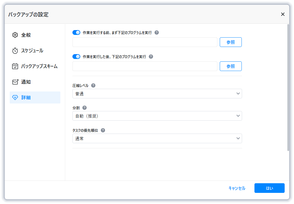 詳細では、コマンド、圧縮、分割モード、タスクの優先度、バックアップ方法、バックアップサービスを設定できます。