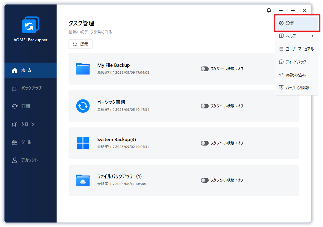 AOMEI Backupperをパスワードでロックできます。これにより、不正アクセスを防ぎ、バックアップデータの安全性を高めることができます。