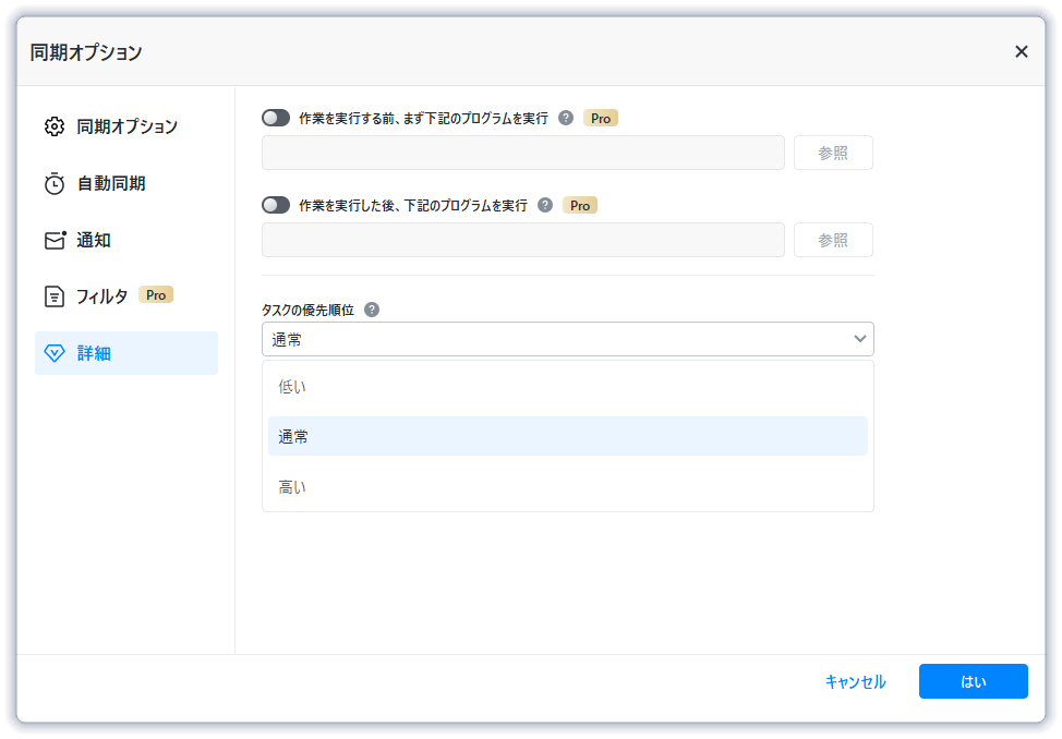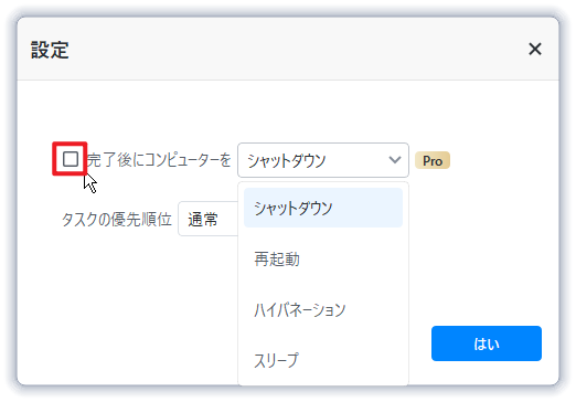 同期実行中は進行状況を確認できます。また、画面左下の「設定」をクリックすると、同期完了後にコンピューターをシャットダウン/再起動/ハイバネーション(休止)/スリープに設定できます(有料機能)。同期が完了するまでお待ちいただき、その後「はい」ボタンをクリックしてください。