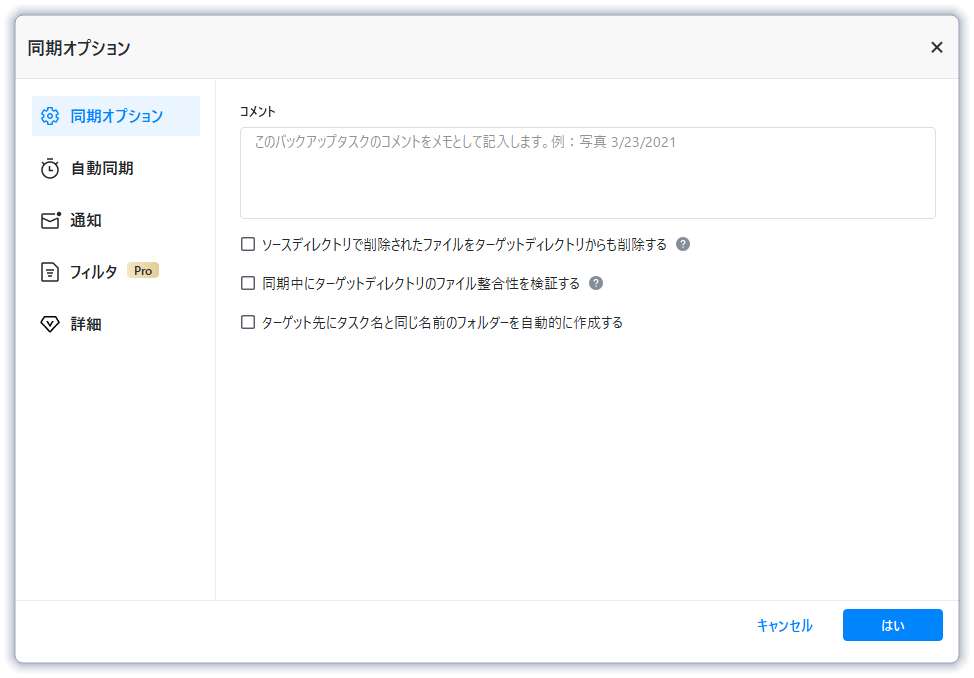 ベーシック同期タスクを再度実行すると、ソースディレクトリの追加・変更されたデータが宛先に同期されます。ソースフォルダで削除したファイルを宛先からも削除したい場合は、「オプション」→「同期オプション」内の「ソースディレクトリで削除されたファイルをターゲットディレクトリからも削除する」にチェックを入れてください。